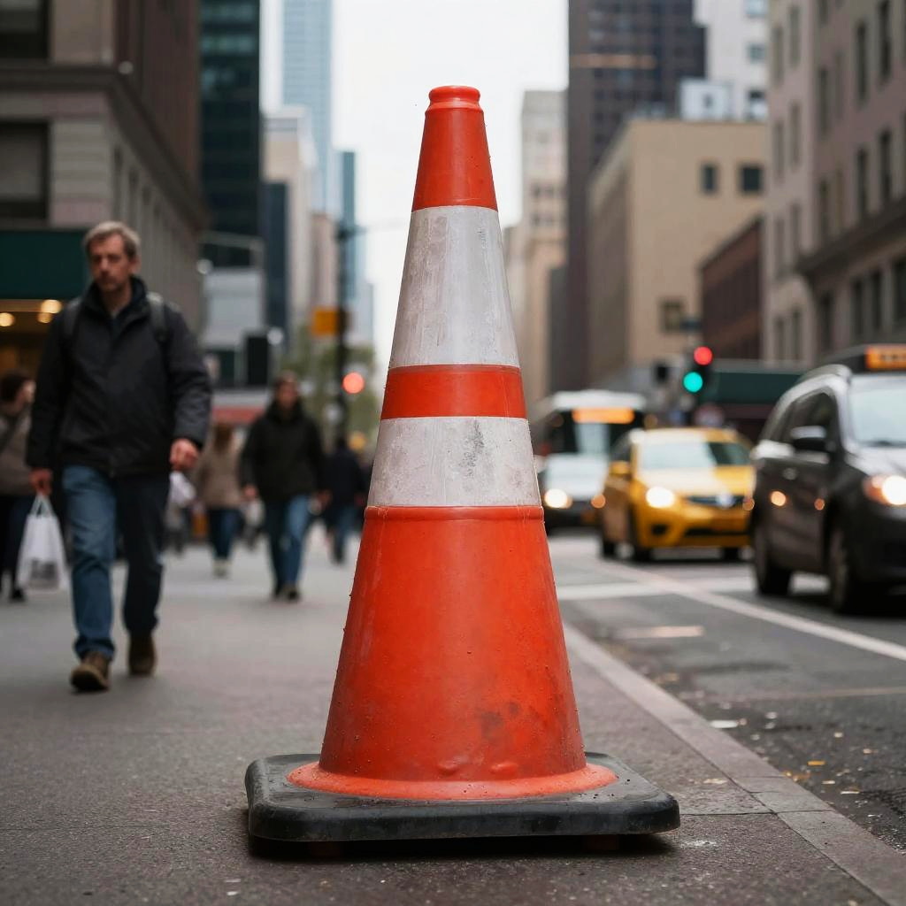 Giant traffic cone towering over a busy city street, hyper-realistic style, dramatic lighting, bustling urban environment, detailed textures