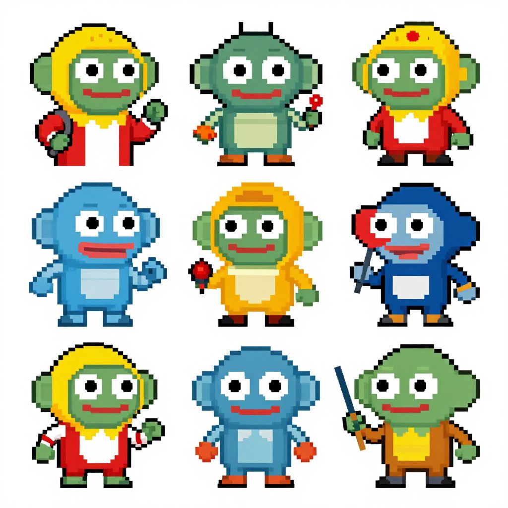 Pixel art of nine colorful, cartoonish, green humanoid characters with different outfits and colors, arranged in a 3x3 grid against a white background