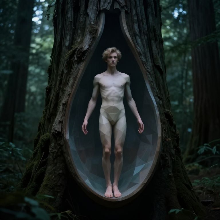 Polyhedron young white male full body suspended inside womb inside Redwood tree, psychedelic, low light, etheric, eerie, strange, natural lighting, environment, detailed, realistic, surreal, nature,