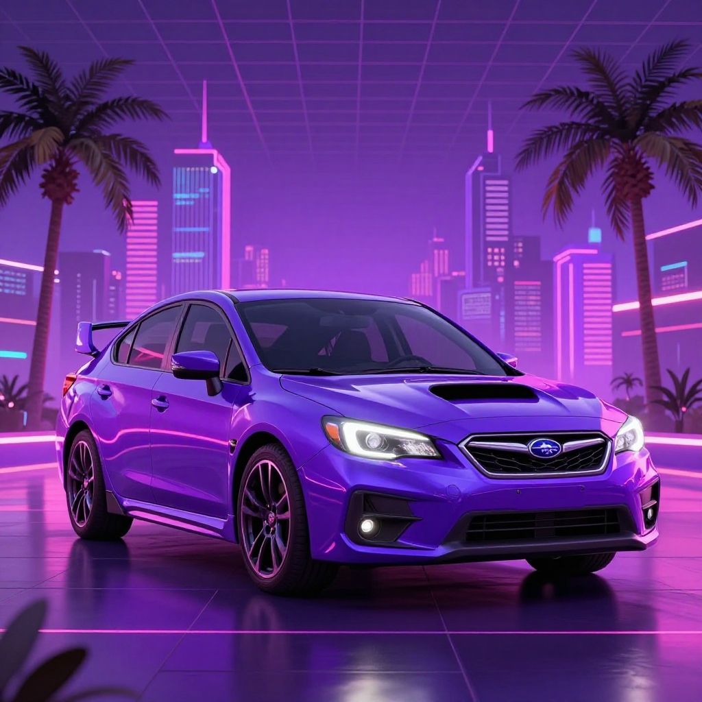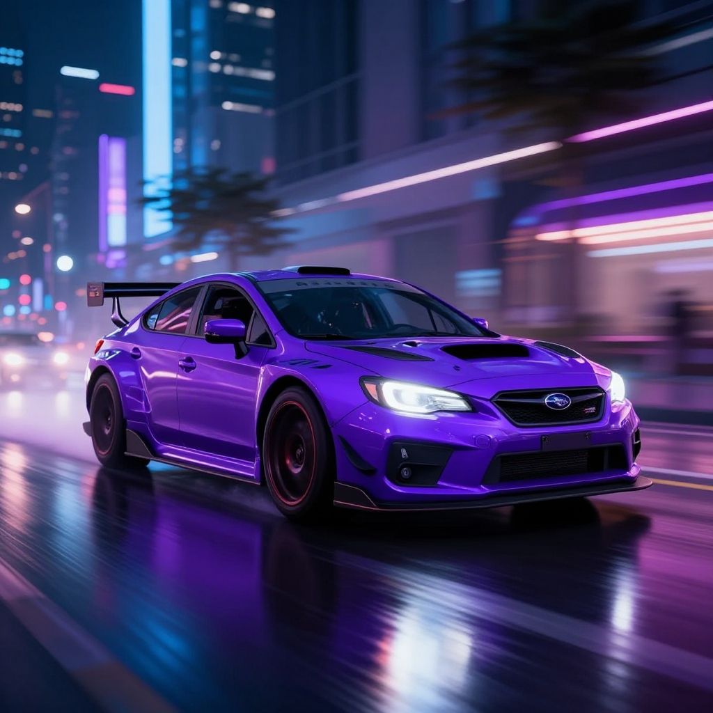 Purple Subaru racing through a neon-lit city street at night, dynamic motion blur, bright reflections on wet asphalt, futuristic urban environment, vibrant purple hues, hyper-realistic style