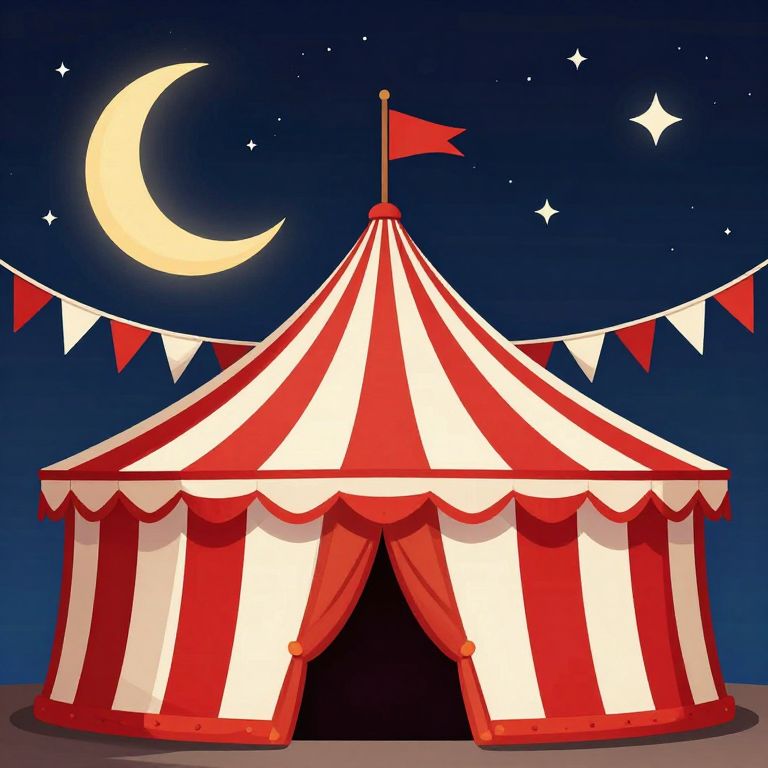 Digital illustration of a red and white striped circus tent at night, with a crescent moon, stars, and red-white bunting.