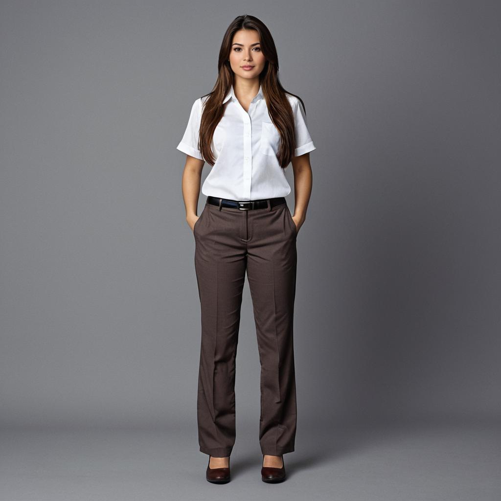 Army green pants costume,1girl, solo, brown hair, sandals, uniform, standing, full body, realistic, hand in pocket, hair bun, military, pants, shirt, short sleeves, military uniform