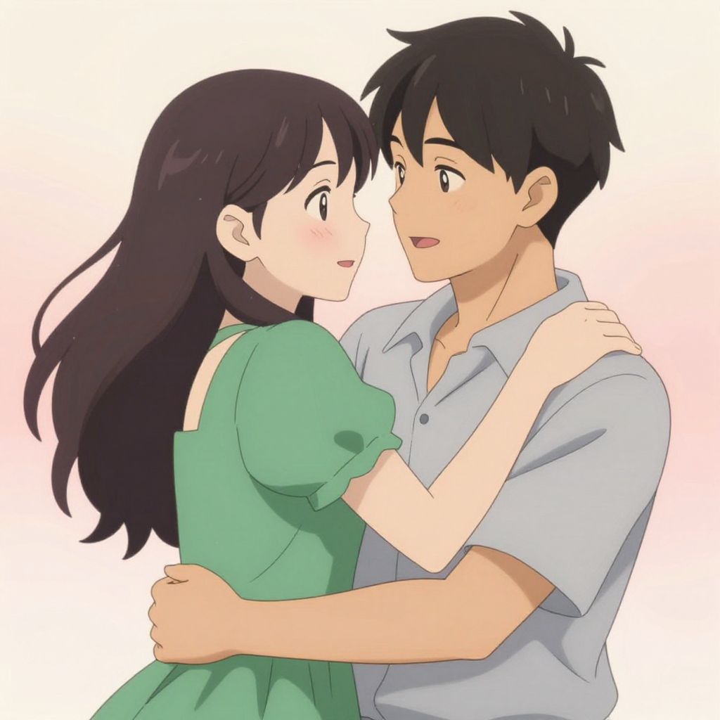 Two anime characters share a tender moment, with the woman in a green dress embracing the man in a gray shirt, both smiling warmly against a soft, pastel background.
