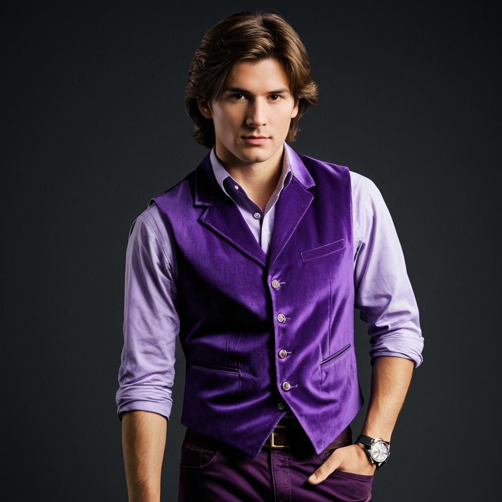 Portrait of a young man wearing a green St. Patrick's Day themed outfit including a green buttoned vest, light green collared shirt, green patterned necktie, green-tinted sunglasses, and dark green pants. He has brown hair and stands against a plain muted background, looking directly at the camera with a neutral expression.