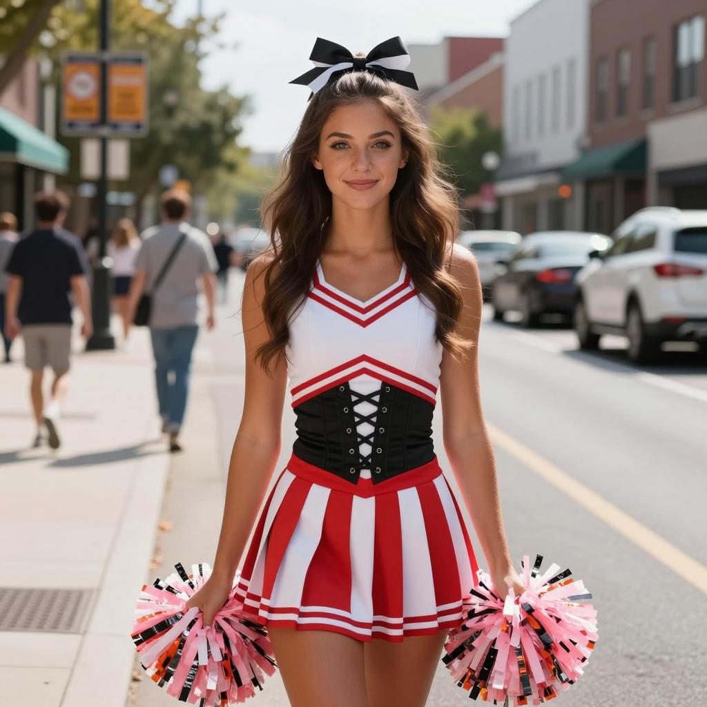 Photorealistic image of a young female cheerleader standing outdoors during daytime. She wears a navy and red Riverdale Vixens uniform featuring a white heart-shaped chest area and a pleated blue skirt with red accents. She has long wavy blonde hair tied with a purple bow and wears white wristbands. The background shows blurred green foliage and a tree, with soft natural lighting highlighting the medium shot of the cheerleader with a serious expression.