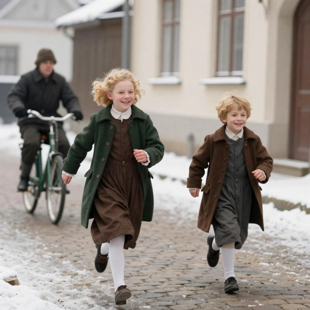 Group of people walking on a dirt road in a rural field. Men and women in historical, 19th-century clothing, some with hats and caps. One man in gray flat cap and jacket leads, carrying a white cloth. Children in front with a bicycle, girl with red dress in middle. Clear sky, grassy background. Faces show various expressions, some neutral, others smiling. Six people in total, bicycles, traditional clothing, grassy field.