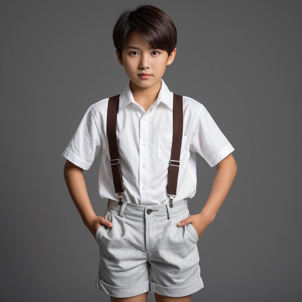 Portrait of a young Asian boy standing outdoors wearing a white long-sleeve collared shirt with thin stripes, black and white vertically striped shorts, and black suspenders. The boy has short black hair and a neutral expression, looking directly at the camera with a blurred green background.