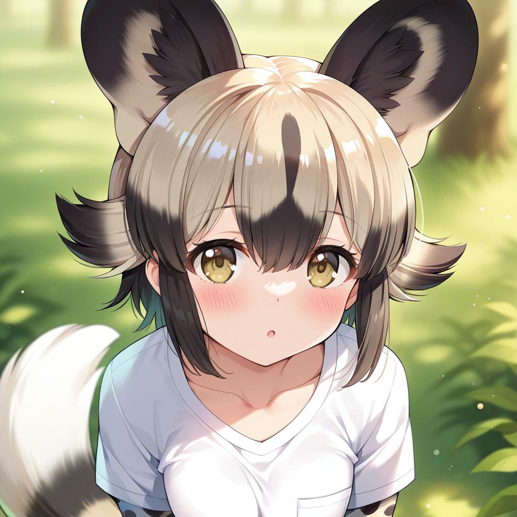 Anime-style illustration of a kemono girl inspired by the African wild dog character from Kemono Friends. The girl has large dog ears, a fluffy tail, multicolored short hair with shades of brown, black, and grey, and expressive brown eyes. She is wearing a white shirt with short over long sleeves, set against a blurred outdoor background with green foliage and soft natural lighting.