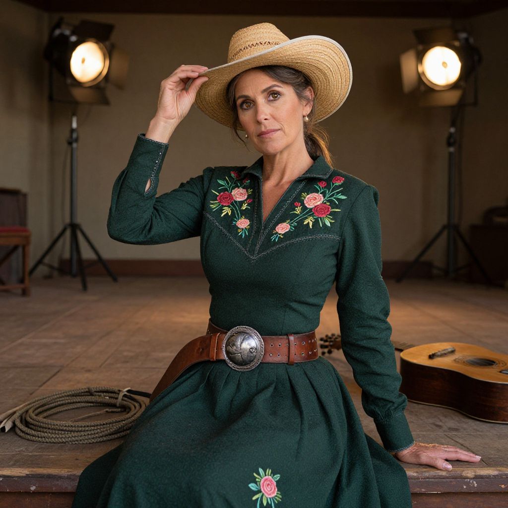 Natural light portrait of a mature woman dressed in a vintage old western female costume: a dark green dress with embroidered roses, a leather belt with a silver buckle, and a straw hat tilted to one side, sitting on a wooden stage in a historical frontier theater, her face is composed, with warm brown eyes and a calm expression, surrounded by old stage lights and dusty props like a lasso and a wooden guitar.. The woman has big breasts and cute face