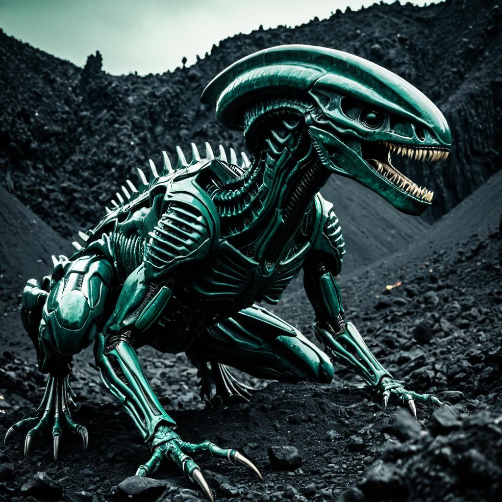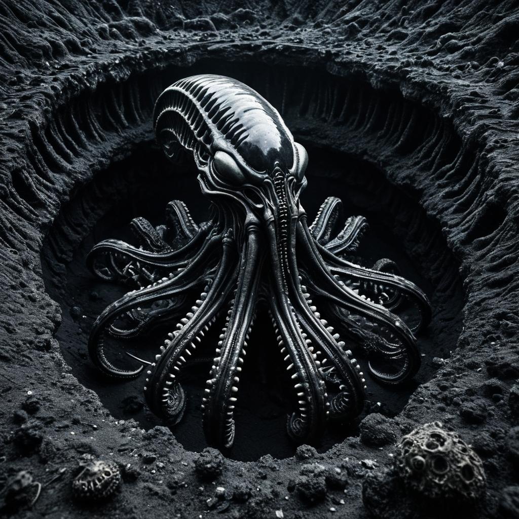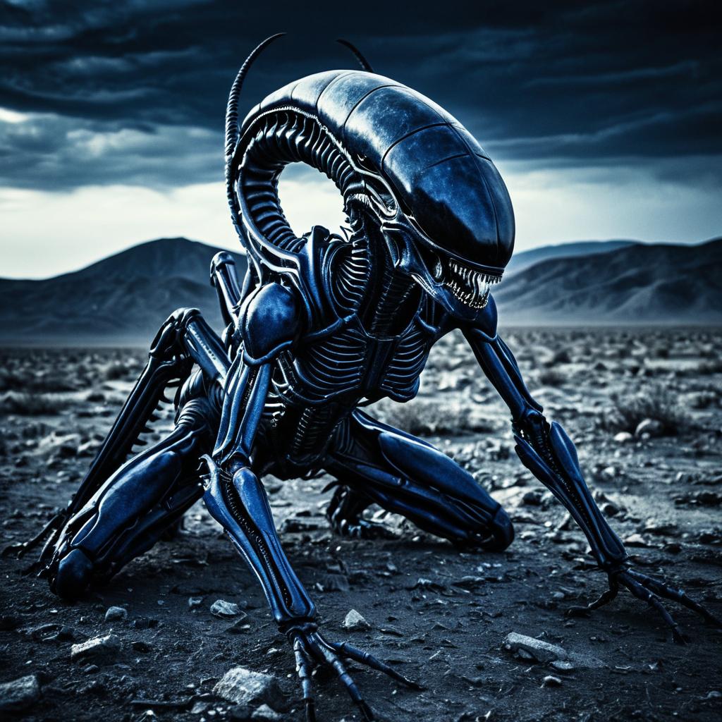 Insectoid xenomorph midnight blue in a barren wasteland, H.R. Giger style, intricate details, ominous atmosphere