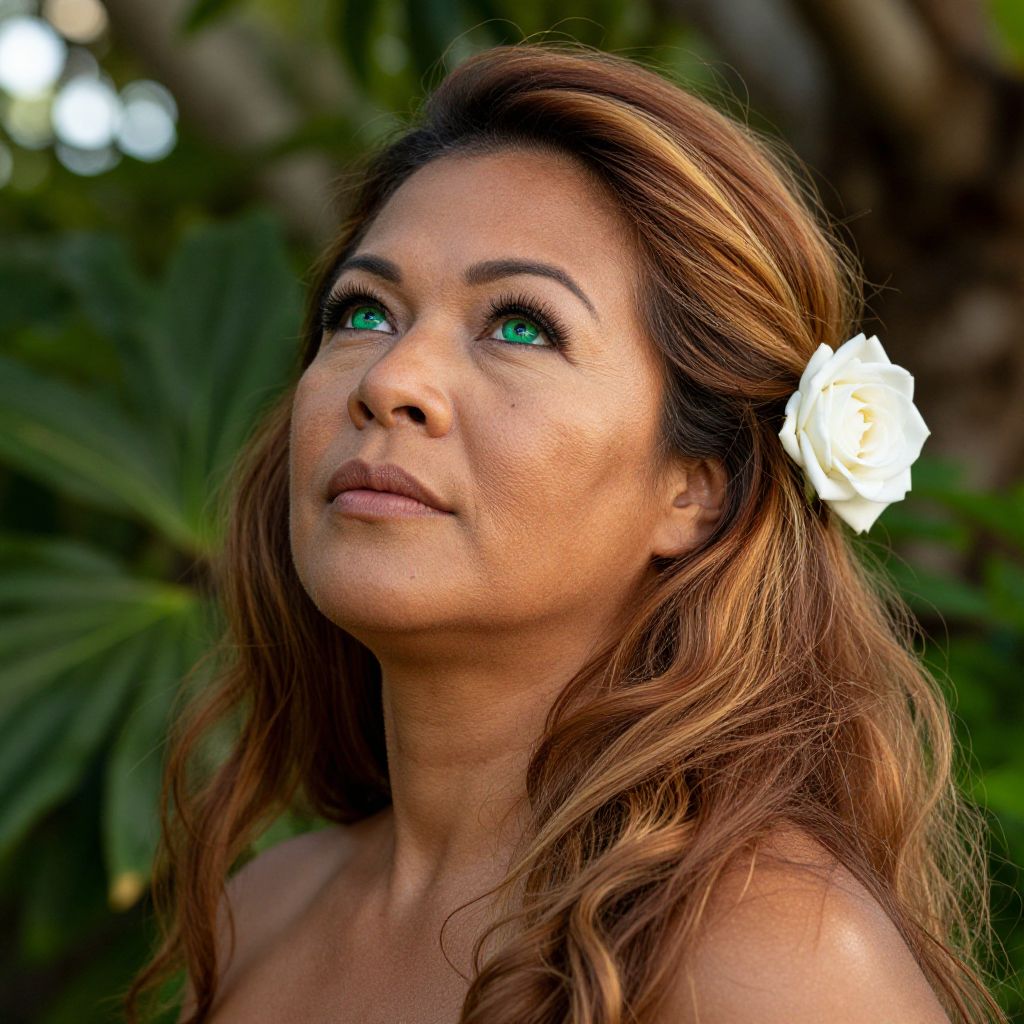 Craft a photorealistic portrait of a Polynesian woman in her late 30s with flowing chestnut hair streaked by golden highlights, gathered into an elegant, loose ponytail adorned with a solitary white rose. Her piercing emerald green eyes, surrounded by delicate laugh lines and subtle freckles, convey warmth and intelligence. The three-quarter view captures her gazing upwards, lost in contemplation of the vast sky above. Set amidst lush greenery, soft sunlight filters through the leaves, casting dappled shadows on her face, creating an atmosphere of introspection and inner strength. The lighting highlights the texture of her skin, accentuating natural beauty marks across her cheeks and forehead, while drawing attention to the depth and dimension of her striking eyes.
