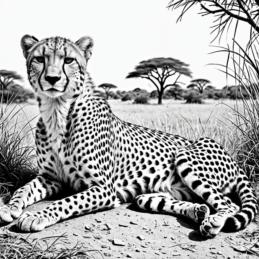 High-quality black-and-white illustration of a full-body cheetah lying down in a simple African savanna background featuring acacia trees and grass. The image is designed in a coloring book style with clear lines and easy shapes suitable for children.
