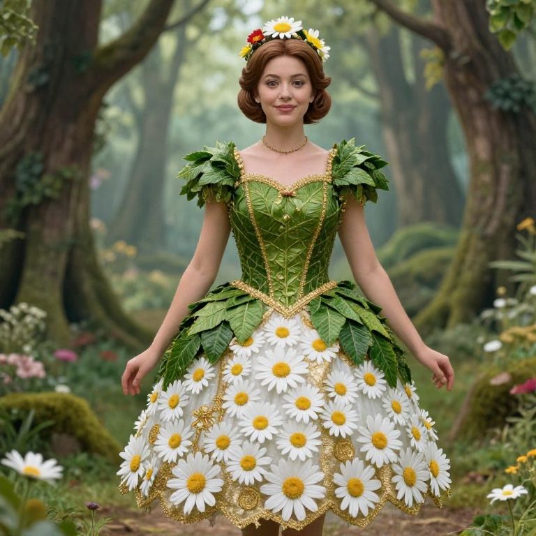 Adult princess daisy costume inspired by nature, including a leafy bodice and daisy skirt, with golden accents and a floral headpiece, standing confidently in a magical forest clearing, ultra-detailed, fantasy realism.