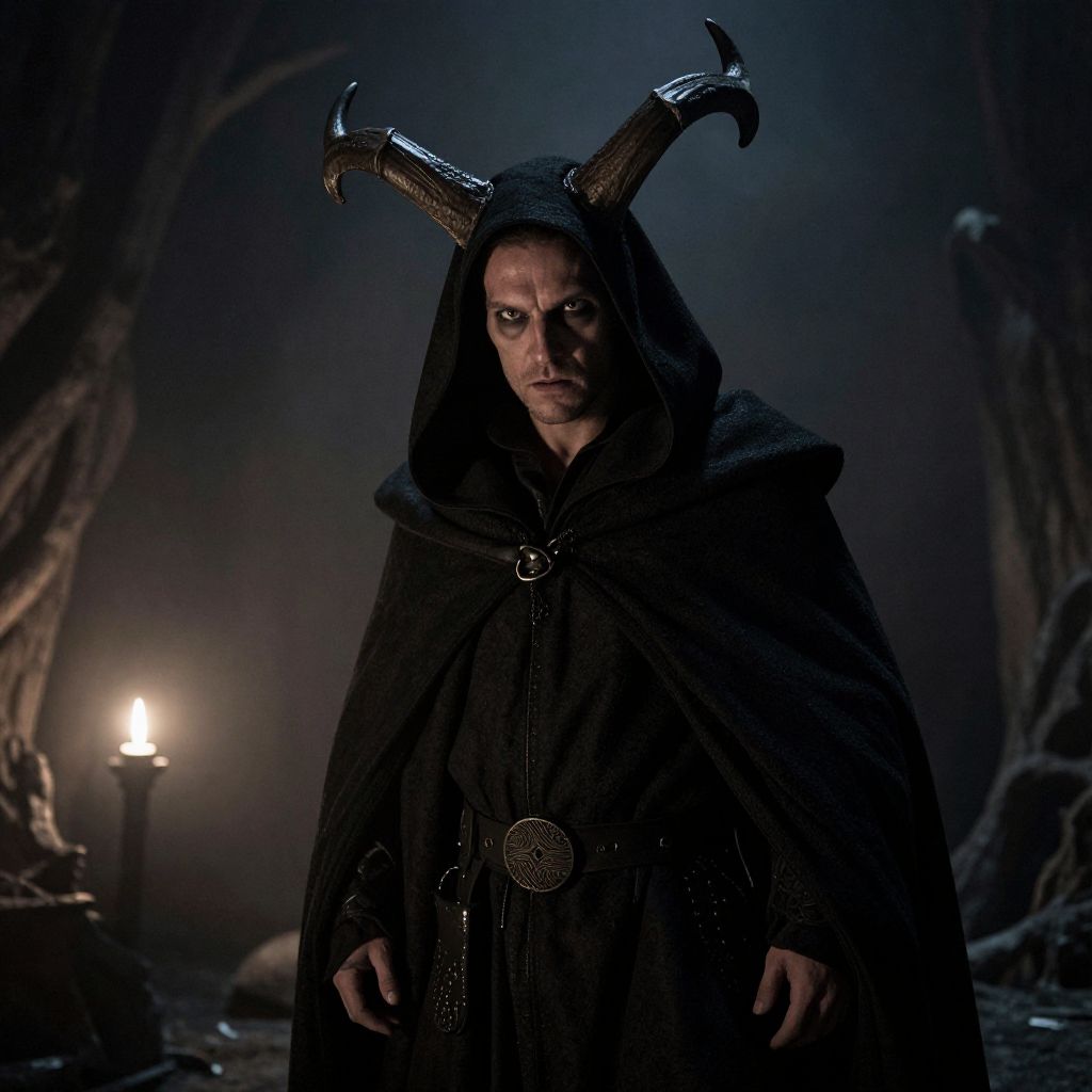Dark fantasy photograph of a serious man with horned hood, black cloak, and intense gaze, standing in a misty, forested night illuminated by