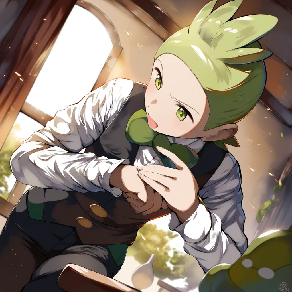 Digital anime-style illustration of Cilan, a male character from Pokemon, featuring green spiky hair, green eyes without visible sclera, wearing a white long-sleeved shirt, black vest with gold buttons, black pants, and a green bowtie. The character is indoors near a large window with warm lighting and a blurred background including a plant and vase.