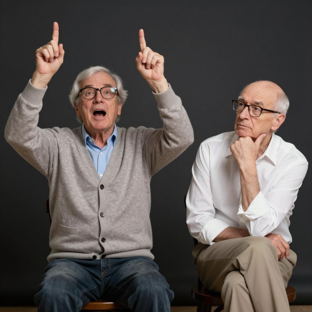 Two elderly men against a dark background. The man on the left, with gray hair, glasses, and a light cardigan, raises both hands with fingers pointing upwards, shouting. The man on the right, with bald head, glasses, and white shirt, rests his chin on his hand, looking slightly to the left. The man on the left sits with legs apart, while the man on the right sits with legs crossed.