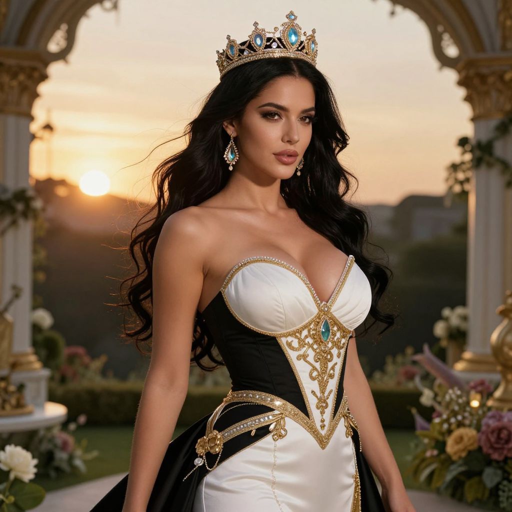 Photograph of a beautiful woman with long, wavy black hair, wearing a white and black strapless gown adorned with gold and blue embroidery. She has a regal crown with blue and gold details on her head, and wears matching blue and gold earrings. Her gown features a deep V-neckline, accentuating her ample cleavage. The background shows a sunset through an ornate archway with lush greenery and blooming flowers. The overall style is elegant and royal, with a focus on opulence and beauty. The lighting highlights her smooth, tan skin and confident expression.