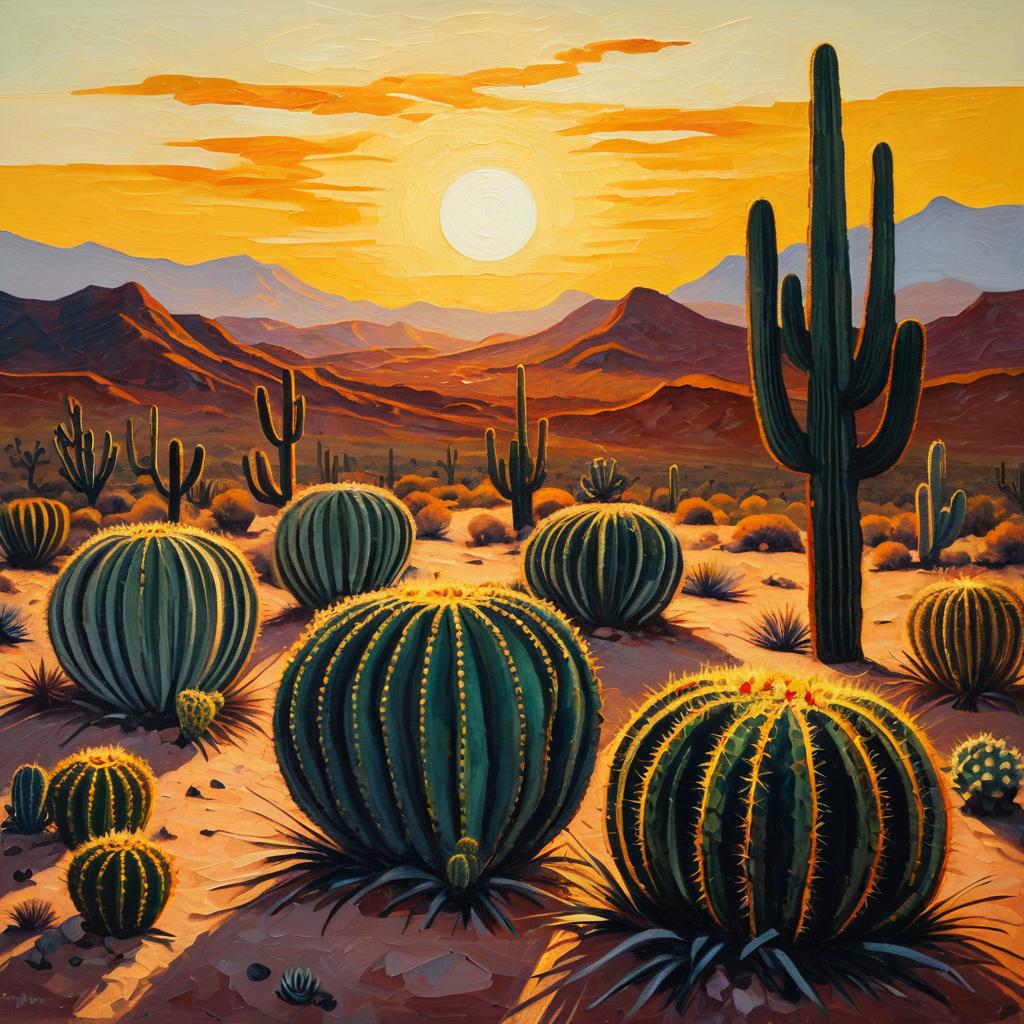 A thick oil painting of a glowing sunrise over a desert landscape with scattered cacti, in the style of Georgia O'Keeffe, Turner. Warm, subdued color palette, textured brushstrokes, abstract impressionism