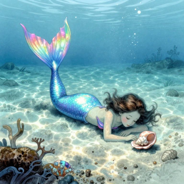 A dreamy underwater scene merges delicate pen-and-ink illustrations with ethereal landscapes, capturing a moment of tranquility where a luminous mermaid rests on the sandy ocean floor. From an overhead view, she gazes pensively at a curious seashell, her vibrant tail fanned out in an array of iridescent hues. The surrounding water shimmers with a soft glow, casting dappled light that illuminates this mysterious subaquatic realm, evoking feelings of wonder and introspection.