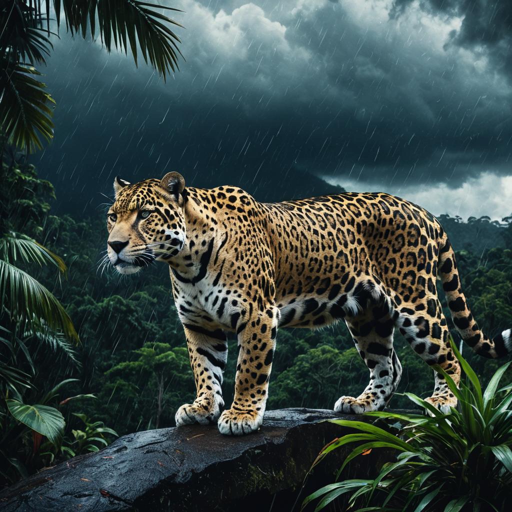 Hyper-realistic digital painting of a majestic jaguar standing on dense tropical rainforest beneath a stormy dark blue and gray overcast sky, its back to the viewer as it turns to look over its shoulder. Cinematic atmosphere, photorealistic detail, without pencil or sketch lines.