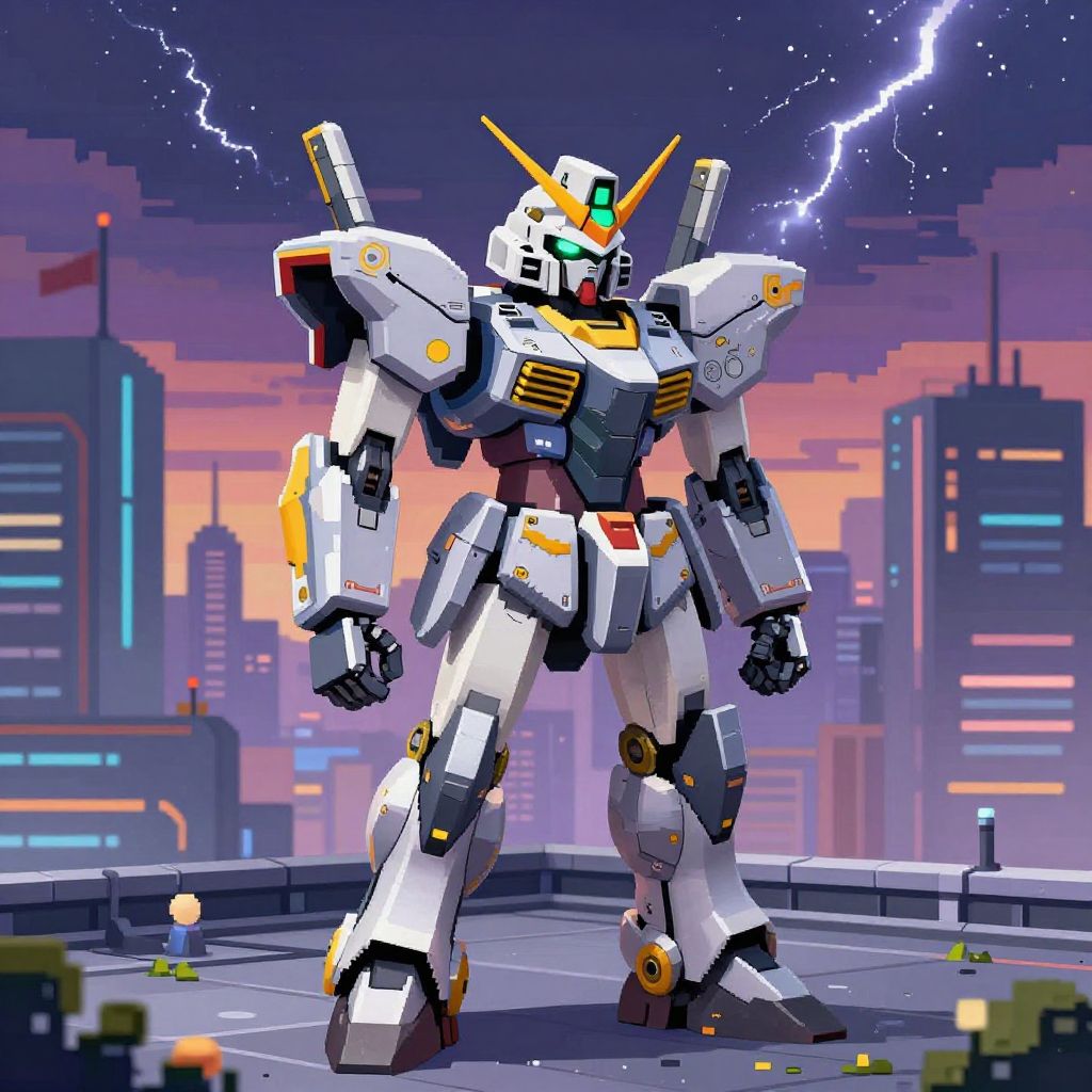 Pixel art of a large, white and yellow robot standing on a rooftop during a lightning storm. The robot has a green visor, yellow horn, and red chest emblem. Its armor features black and orange accents. The background shows a cityscape with tall, illuminated buildings under a purple and orange sunset sky. Small, pixelated objects, including a green square, are scattered on the rooftop. The scene is vibrant and dynamic, with a sense of futuristic sci-fi. Lightning bolts illuminate the darkening sky, adding intensity to the scene.
