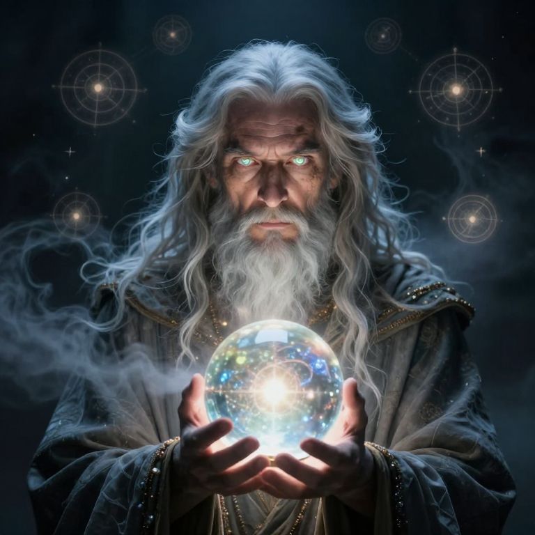 Photorealistic digital artwork of an elderly, white-haired wizard with glowing green eyes and a long, flowing white beard. He wears a dark, ornate robe with gold accents. The wizard holds a glowing, spherical crystal orb emitting bright light and blue-white sparkles, with misty smoke curling around it. The background is a dark, starry night with circular, glowing patterns. The wizard's intense expression and detailed facial features suggest wisdom and power. The image has a mystical, ethereal atmosphere.