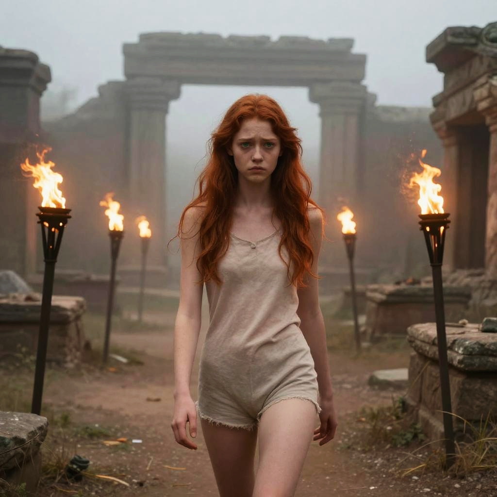 Photorealistic full body shot of a slender young woman with long flowing red hair walking barefoot on a wooden dock by a misty lake in early morning. She is wearing a white tank top and khaki cargo shorts. The scene features a serene, cinematic atmosphere with foggy background and calm water.