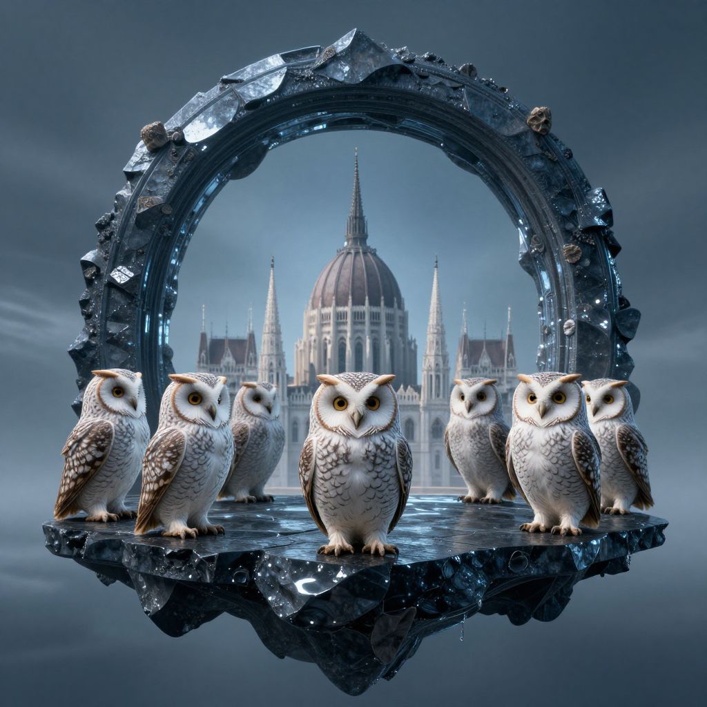 A parliament of owls with human faces debate beneath a floating obsidian arch made entirely of silence.