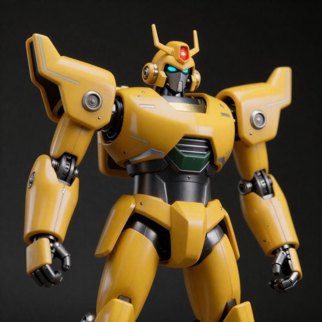 Yellow robot with large angular arms, rectangular head, and black eyes. Robot has a gold band around its neck and a red light on top. Green "Ifrit" on chest. Background is dark with metallic ures. Robot's arms are raised, creating a dynamic pose.