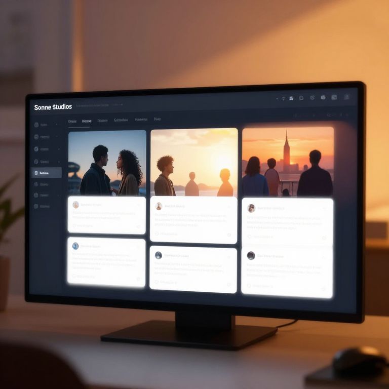 Sonne Studios reviews displayed in a sleek modern interface, artistic background with soft glowing lights, customers engrossed in reading detailed testimonials, warm inviting colors, digital art style, professional and clean layout