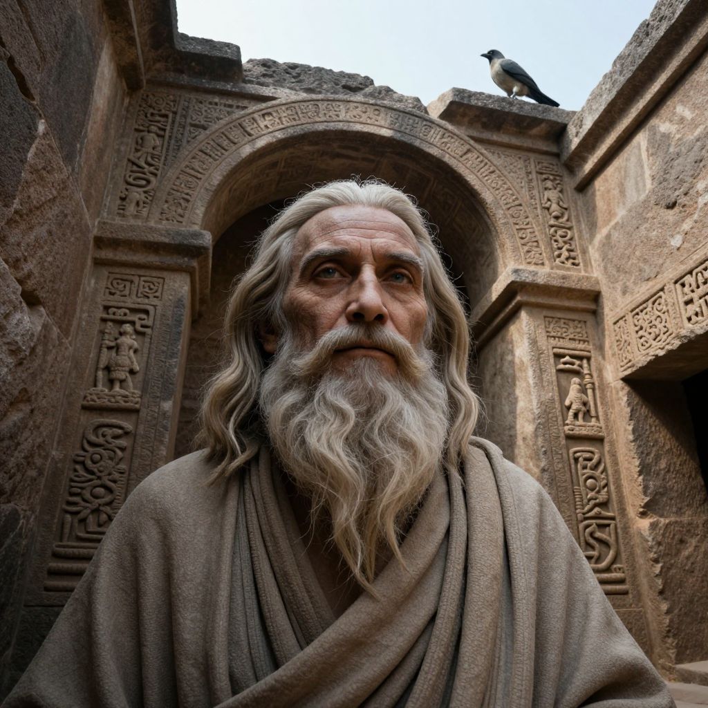 Photograph of an elderly man with long, wavy, gray beard and hair, wearing a worn, beige robe. He has a weathered, intense expression and is positioned in front of an ancient, stone archway adorned with intricate, Egyptian-style carvings. The stone has a rough texture and is a dark, earthy brown. A bird perches on the archway above him. The background shows more stone walls with similar carvings, creating an ancient, mystical atmosphere. The lighting is natural, highlighting the textures and details of the stone and his robe. The image evokes a sense of historical, Middle Eastern or ancient Egyptian setting.