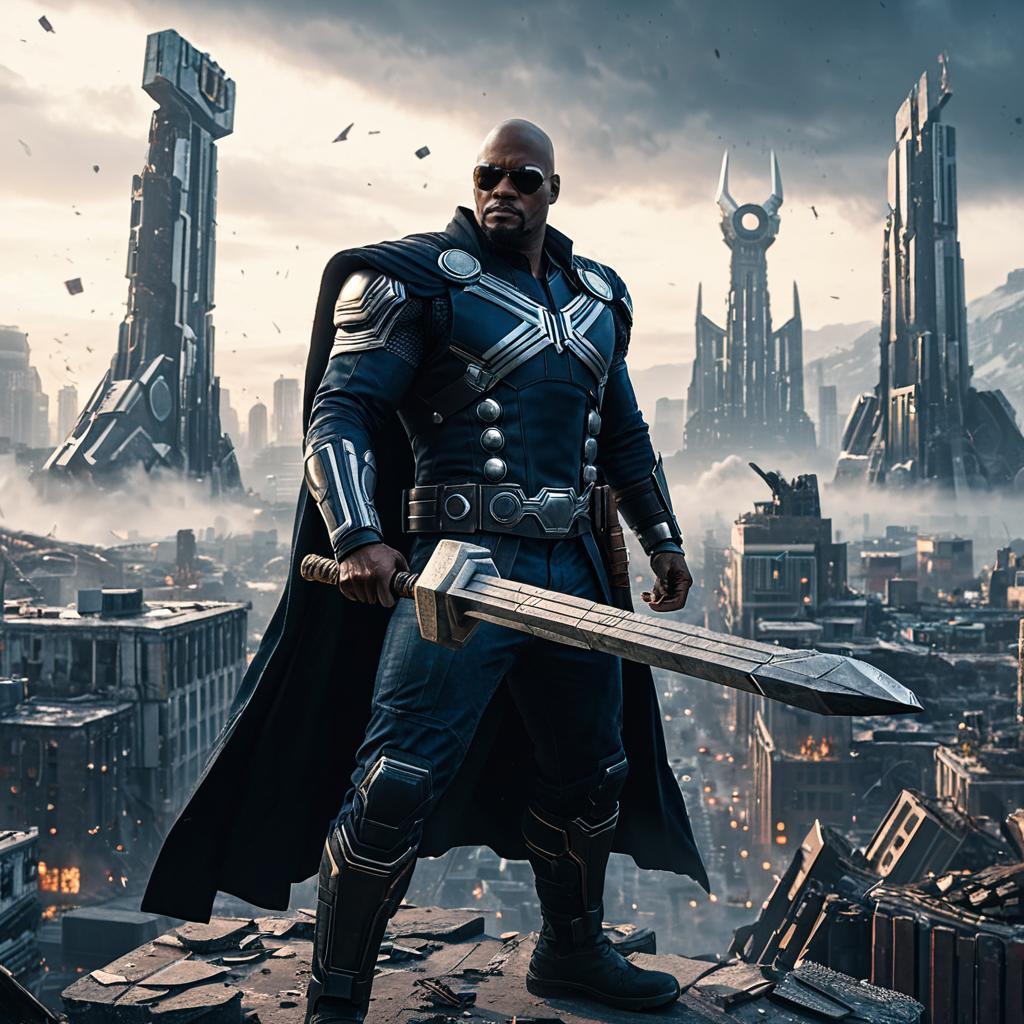 Nick Fury wielding Thor's hammer roaming crumbling futuristic cityscape during midday, epic full shot with cinematic twilight lighting and volumetric fog, octane render, ultra-realistic photorealistic 8K hyper-detailed textures, award-winning ArtStation quality.