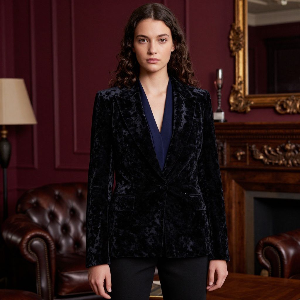 A sophisticated woman in her late 20s with fair skin, curled dark hair, and a thoughtful expression wears a black velvet blazer over a crisp navy blouse. The blazer is styled with a slight tailoring, tailored lapels, and a deep collar. She stands in a vintage-inspired living room with leather armchairs and rich wood furniture, where the deep red and burgundy tones of the room enhance the contrast of the velvet fabric.