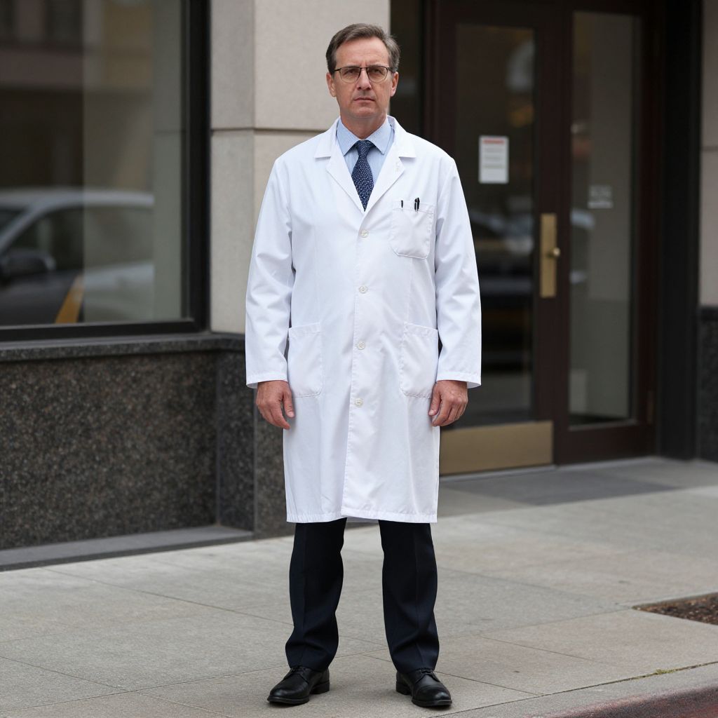 Photograph of a middle-aged man standing on a city sidewalk. He wears a white lab coat over a light blue dress shirt and a dark blue tie, paired with black dress pants and black shoes. He has short brown hair, glasses, and a serious expression. A pen is tucked in the left breast pocket of his lab coat. Behind him is a modern building with large windows and a dark granite base, reflecting a slightly blurred cityscape. The sidewalk is light gray, contrasting with the darker building facade.