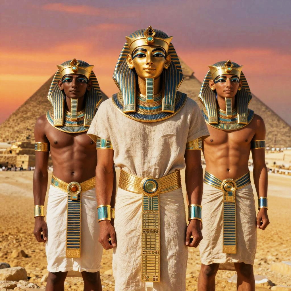 Egyptian models male posing in traditional linen garments, intricate gold jewelry, standing against the backdrop of ancient pyramids under a vivid sunset sky, detailed and realistic style.