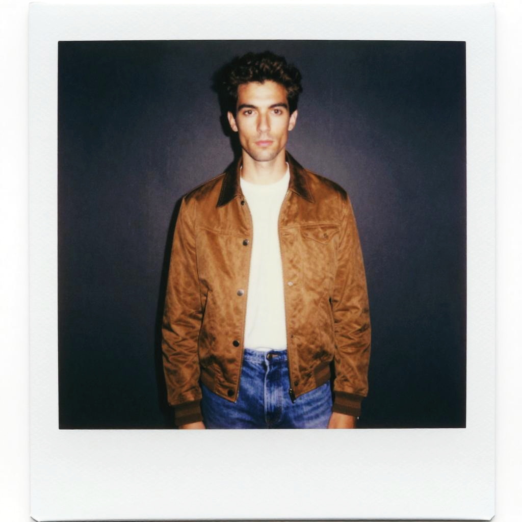 A stylish man stands confidently, embodying a casual yet artistic look with a vintage touch, reminiscent of a Polaroid instant camera aesthetic. His outfit includes a brown jacket, white t-shirt, and blue jeans, capturing a timeless, relaxed vibe.