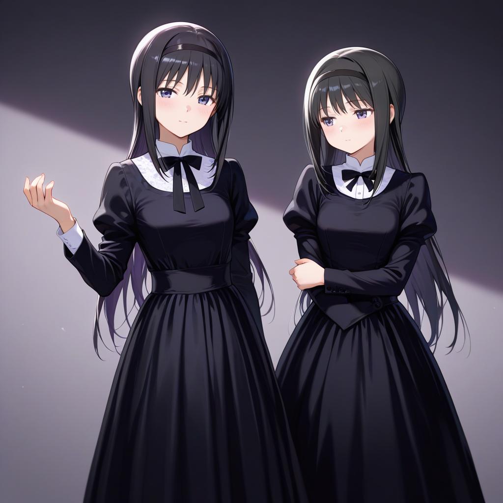 Digital illustration of two anime girls with long black hair and purple eyes wearing black dresses with white collars and black hairbands. Both characters have a solemn expression, dressed in funeral-style attire inspired by Akemi Homura from Mahou Shoujo Madoka Magica.