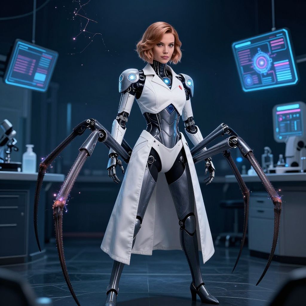 Olivia Octavius costume art, portraying a powerful female scientist with articulated spider appendages, mixing soft fabric and hard mechanical parts, glowing energy cores embedded in armor, set in a dark laboratory with electric sparks and holographic displays