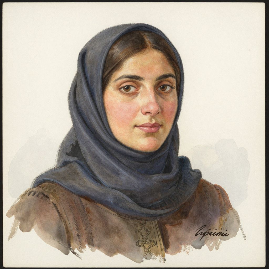 Realistic digital portrait of a young South Asian woman with dark hair, wearing a navy blue headscarf and brown garment, with soft, warm lighting
