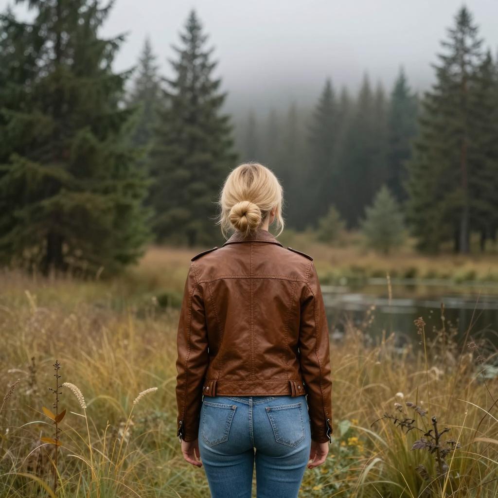 Blonde woman with long wavy hair, wearing a black hat and brown dress, walks on a road at sunset. She points to the right with her right hand, backpack on her left shoulder. Sun sets in the background. Grass and field on the left, road on the right.