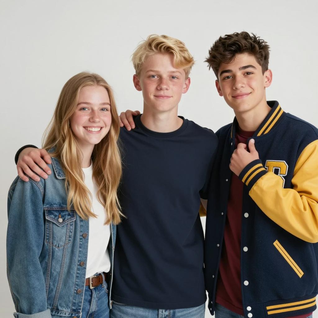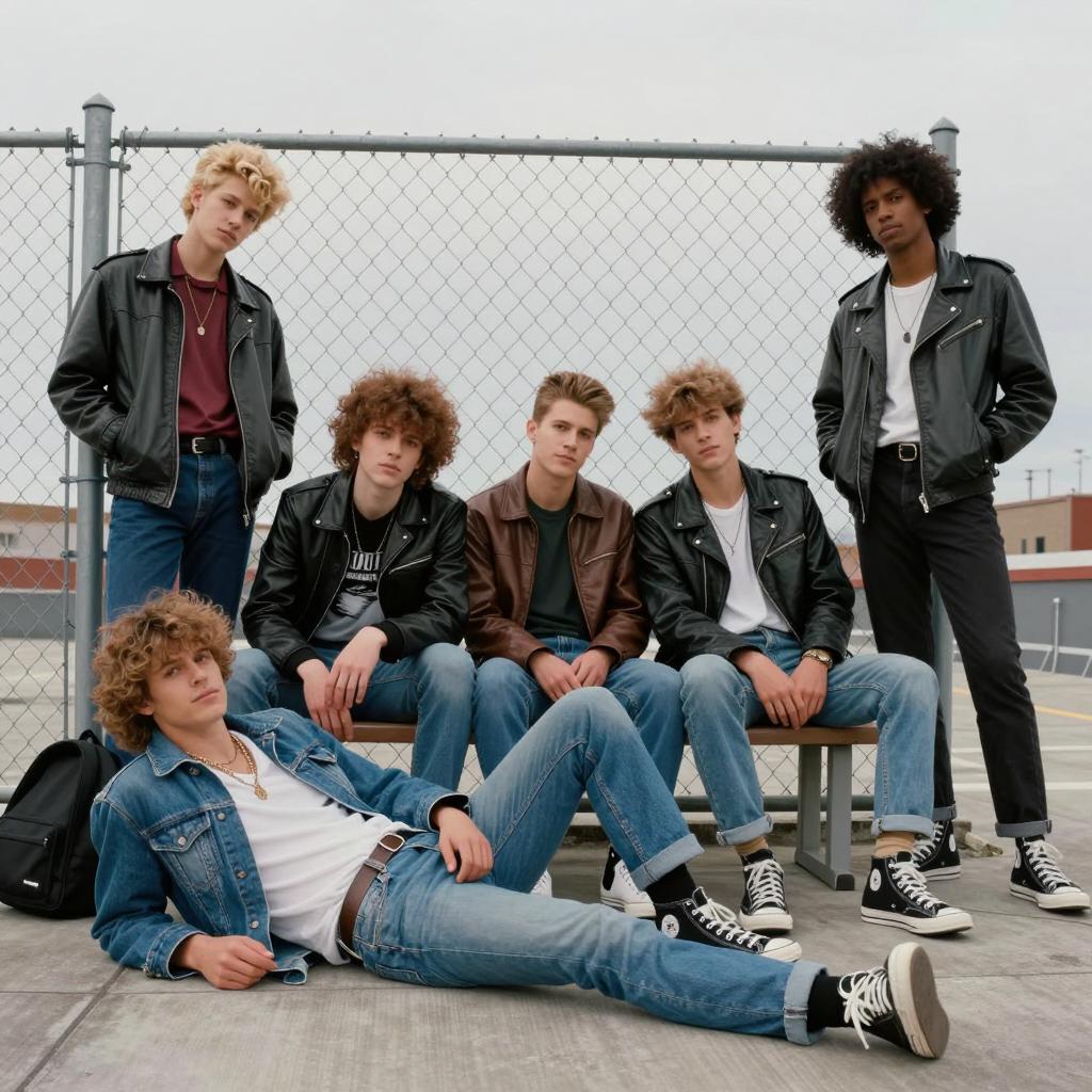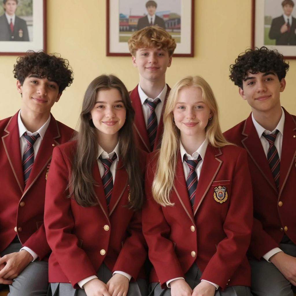 Group photo of six teenagers. Five boys and one girl, leaning on red and blue inflatable obstacle. Five wear formal suits, one in red tank top, one in black tank top, one in white tank top. Girl in white blouse with braid. All smiling. Outdoor setting with trees in background. Boys' hair varied, some dark, some blonde. Girl's hair light brown. Casual, relaxed pose.