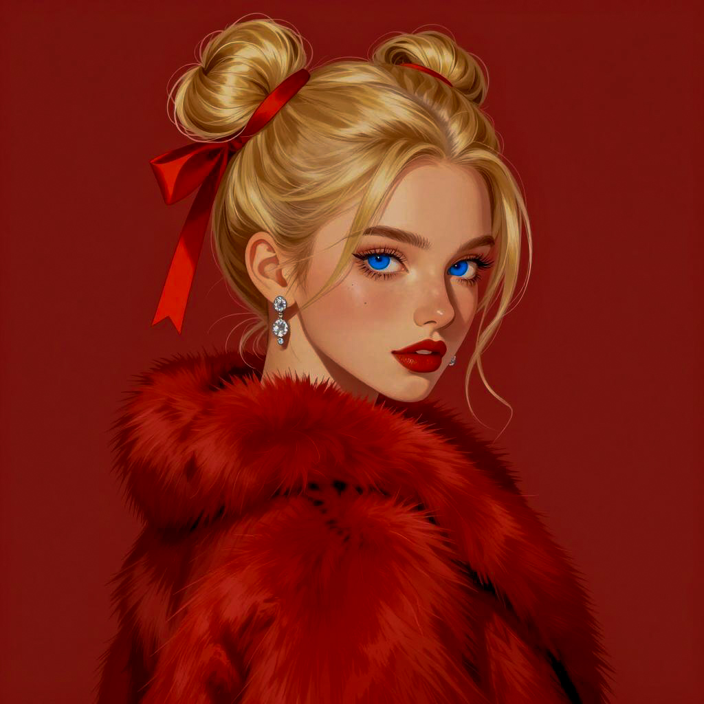 Digital illustration of a young woman with fair skin, long wavy blonde hair, and intense blue eyes. She wears a loose, painterly blouse with blue and gold patches, and elaborate, dangling earrings. Her lips are full and painted red. She stands against a blurred, dark background. Her expression is serious and focused.