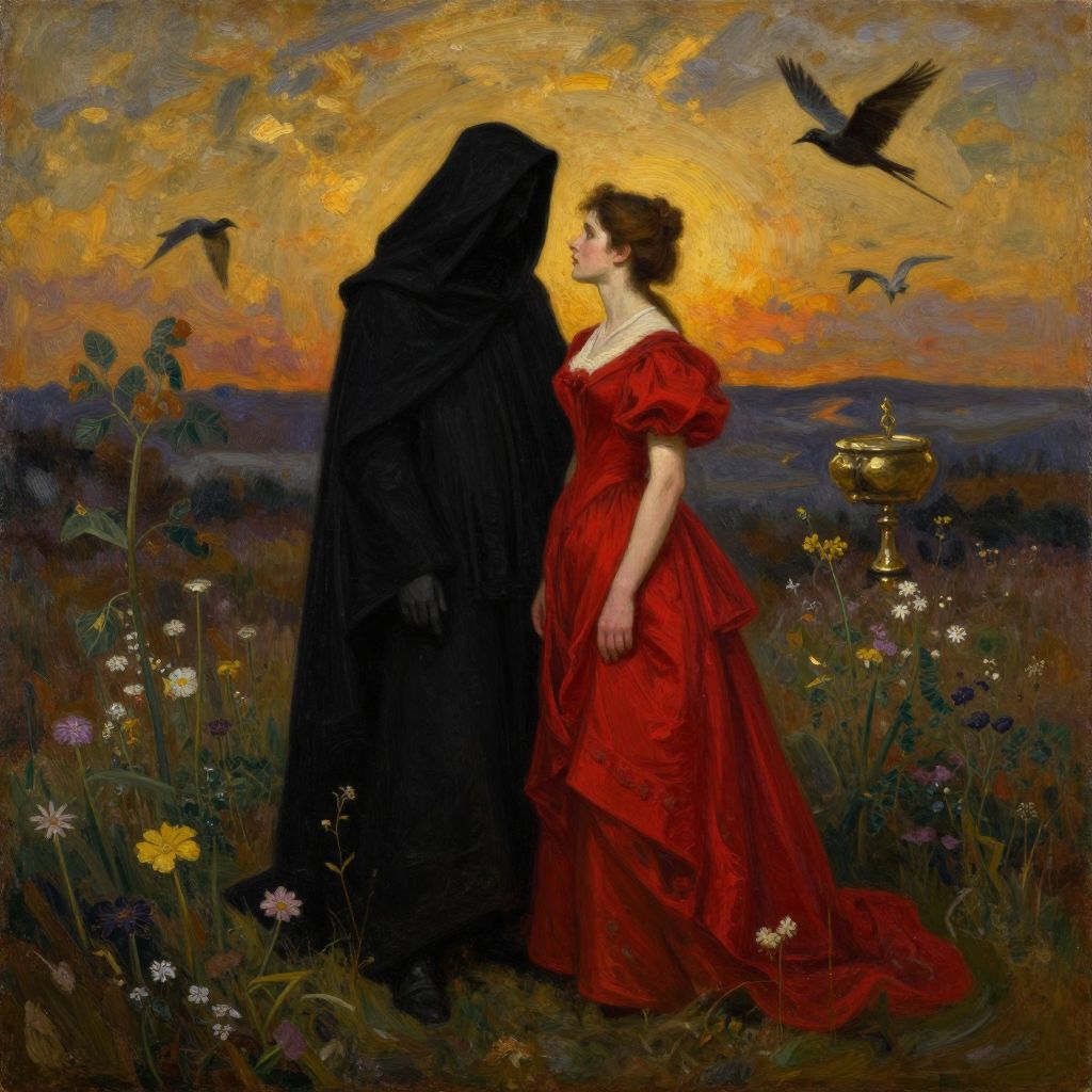 Oil painting: A woman in a red dress gazes at a hooded figure in a dark cloak at sunset, surrounded by wildflowers and birds.