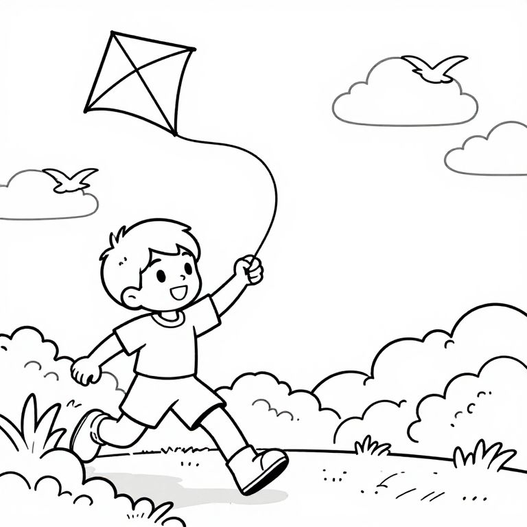Black and white line drawing of a smiling boy flying a kite, running through grassy field with clouds in the sky.