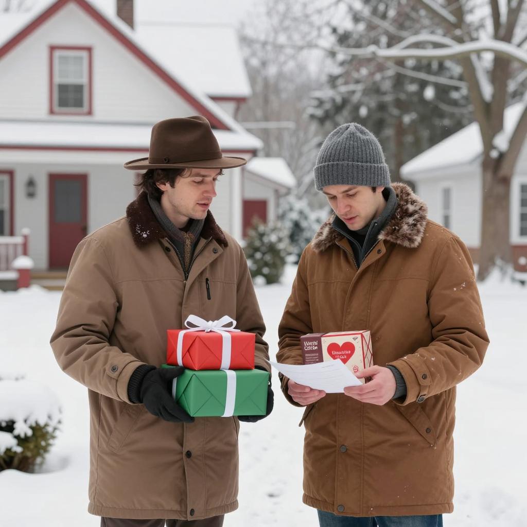 Two men stand in a snowy yard. The man on the left wears a brown hat, brown coat, and gloves, holding colorful wrapped presents and a green box. The man on the right wears a gray beanie, brown coat with a fur collar, and looks down at a box labeled "Valentine Coffee." A white house with red roof and snow-covered trees are in the background. The men are close, engaged in conversation. The man on the right holds a piece of paper. Snow covers the ground and yard.