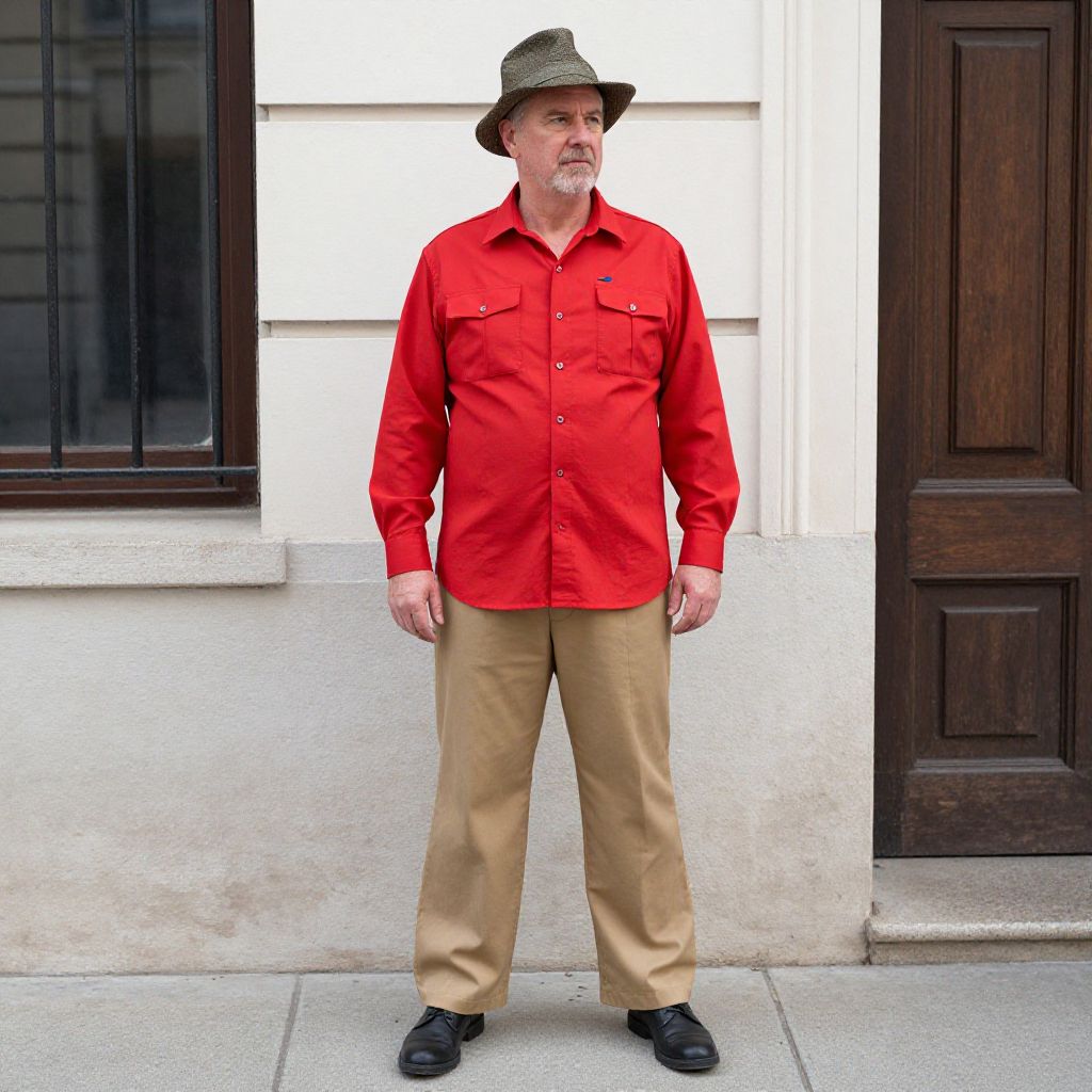 This photograph features an elderly white man standing in front of a building with a white wall and dark brown wooden door. He has a gray beard and mustache, and is wearing a brown fedora hat, a bright red long-sleeve shirt with two chest pockets, tan pants, and black shoes. His shirt is slightly oversized, and he stands with his hands by his sides. The building's window to his left has black bars. The sidewalk beneath him is light gray. The image has a high-contrast, slightly saturated color style.