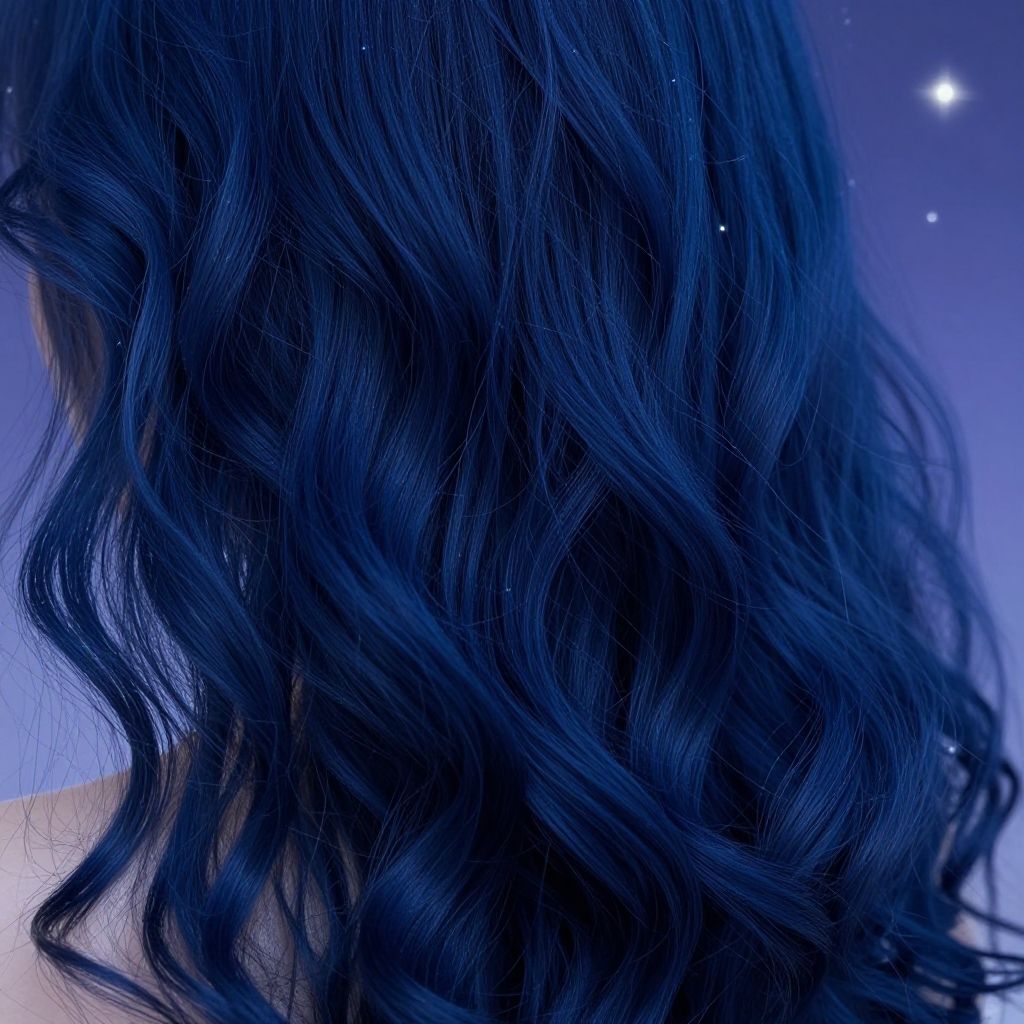 Close-up photograph of wavy, dark blue hair against a gradient blue background with small white star-like dots. Hair appears shiny and voluminous.