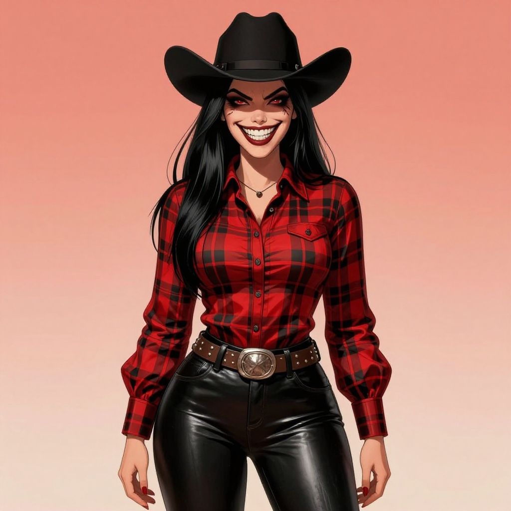 This digital illustration depicts a confident woman with long black hair, wearing a black cowboy hat, red plaid shirt, and black leather pants. She has a wide, mischievous smile, revealing white teeth. Her outfit is accessorized with a brown leather belt featuring a large, ornate buckle. The background is a gradient of pink to white, adding contrast to her dark attire. The art style is bold and colorful, with sharp lines and a comic-book-like quality, emphasizing her confident and playful demeanor. The woman's stance is relaxed, with her hands by her sides.