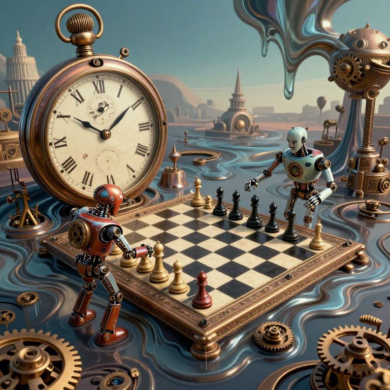 Envision a surreal dreamscape where high-tech steampunk elements meld with Dalí-esque distortion. Observe an aerial view of a chess match between anthropomorphic robots within a giant, liquid-like metal structure reminiscent of a melting pocket watch. The game board and pieces are crafted from intricate gears and cogs, set against the backdrop of flowing metal and distorted geometry. The robots possess exaggerated features and move with both grace and mechanical precision as they strategize over each chess move. This unique blend of surrealism and technology creates an atmosphere that is both fantastical and thought-provoking, inviting viewers to explore the intricate details and hidden meanings within this dreamlike realm.