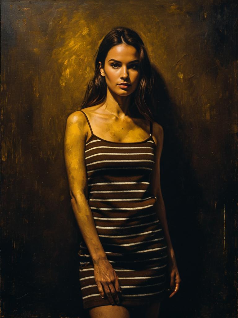 A detailed portrait of a woman with medium-length wavy dark hair wearing a casual chic black speckled shift dress. The dress features thin straps, a ruffle overlay on the bodice, and a keyhole detail at the neckline. The background is dark and textured, highlighting the subject's poised and confident expression.